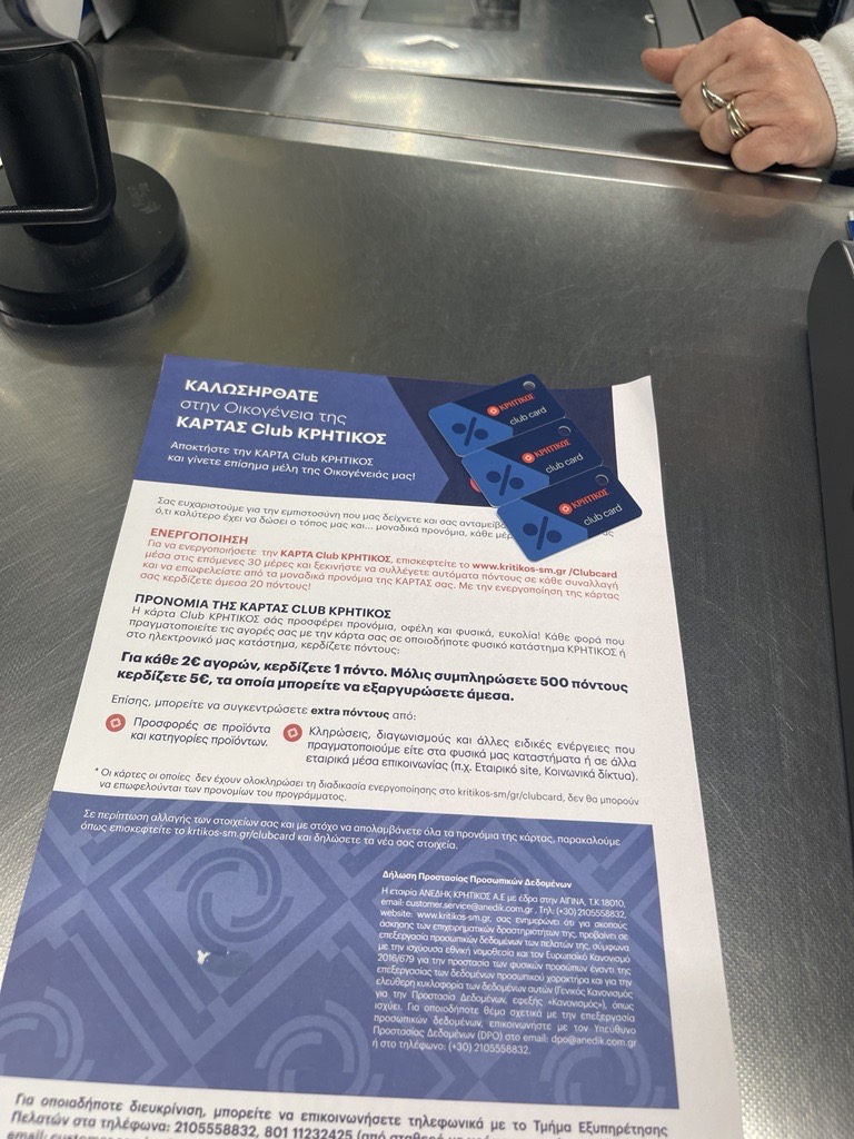 Για την παραλαβή της ειδικά προσημειωμένης εκπτωτικής κάρτας θα πρέπει να επισκεφτείτε τα γραφεία του Συλλόγου. Η κάρτα club ΚΡΗΤΙΚΟΣ είναι πλέον διαθέσιμη στα γραφεία μας για τα εγγεγραμμένα ή εν δυνάμει μέλη που θα ολοκληρώσουν την εγγραφή τους στο σύλλογο.