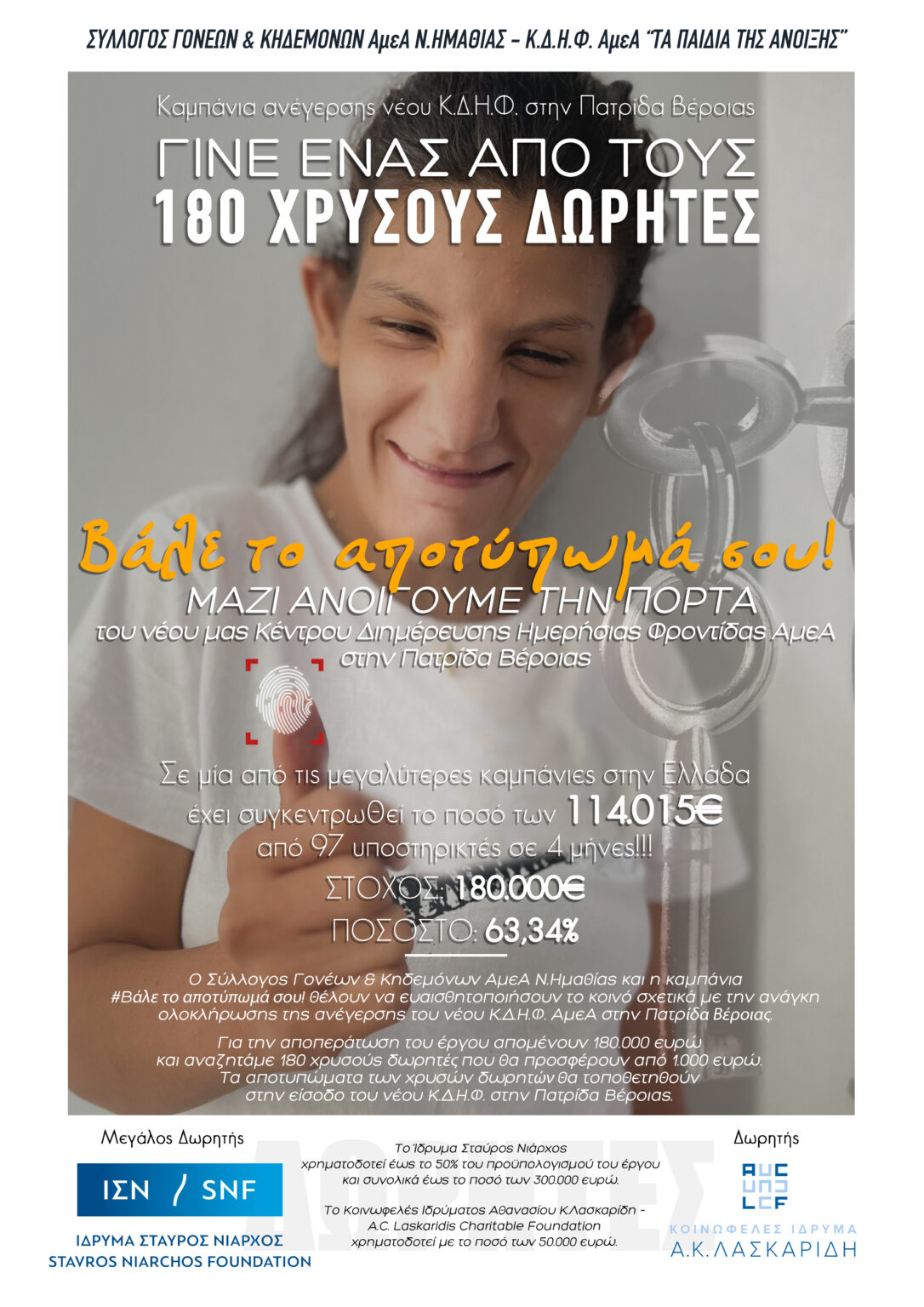 Ως εκ τούτου οι δύο Σύλλογοι έχοντας ομοειδείς ανάγκες κα με το βλέμμα συνολικά στραμμένο στην κοινωνία, ξεκινούν την δράση συγκέντρωσης χρημάτων (ελάχιστο χρηματικό ποσό 1000 ευρώ), με απώτερο στόχο να δωριστούν στα παιδιά της Άνοιξης για την ολοκλήρωση της ανέγερσης και της λειτουργίας του νέου Κ.Δ.Η.Φ. ΑμεΑ «Τα Παιδιά της Άνοιξης» στην Πατρίδα Βέροιας, βάζοντας το αποτύπωμα τους τόσο οι τρίτεκνες όσο κι οι πολύτεκνες οικογένειες.