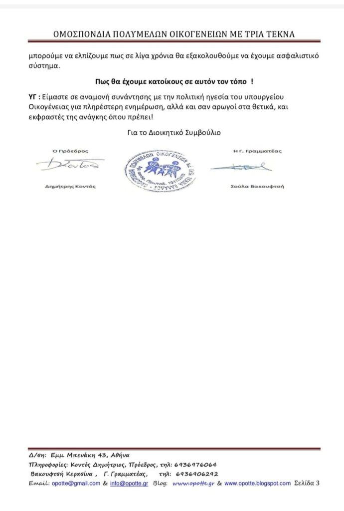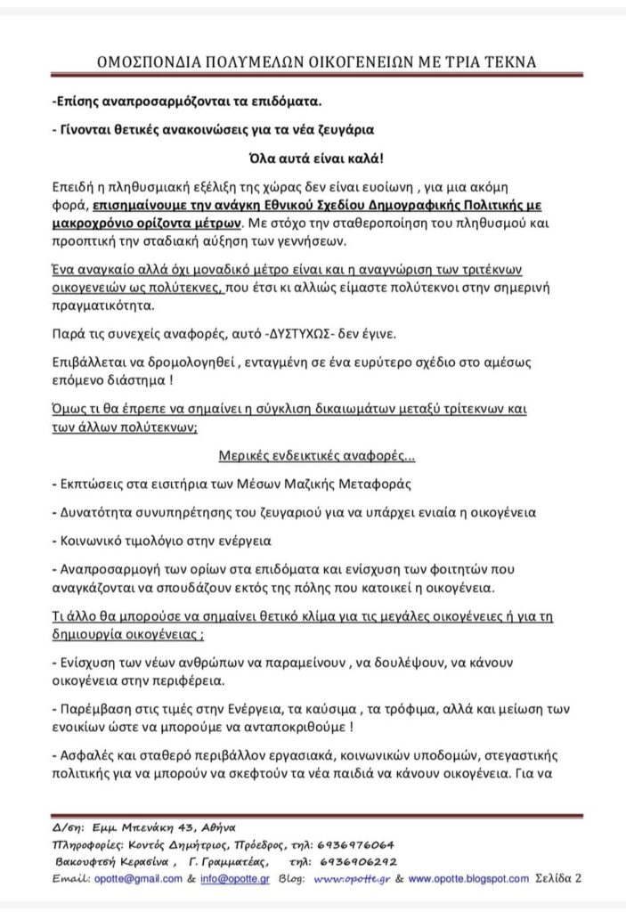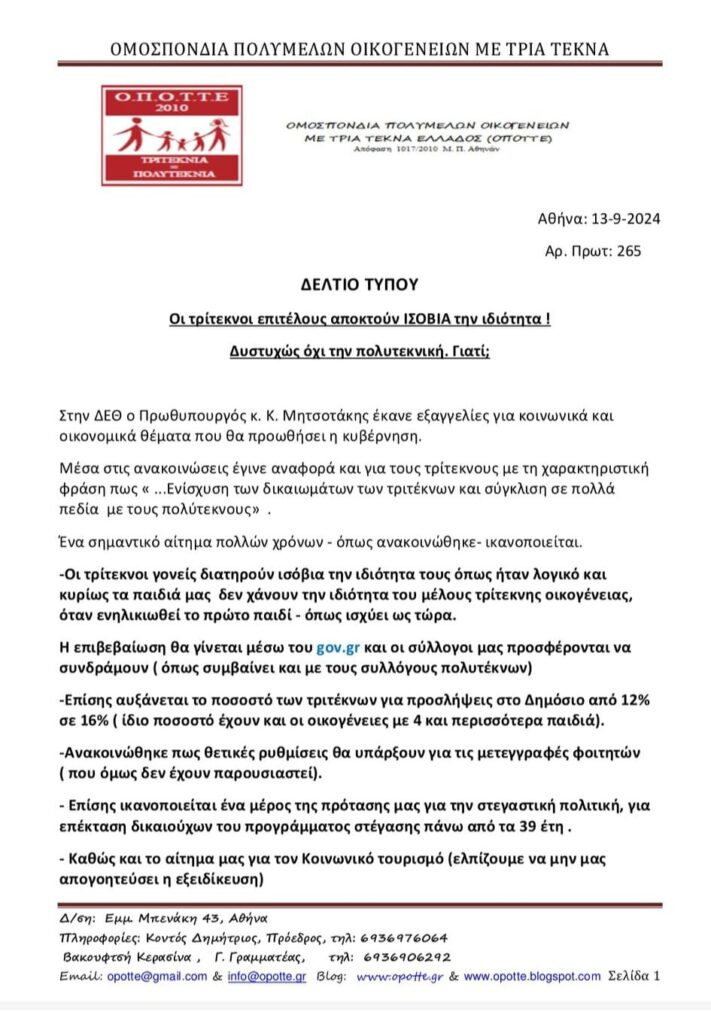 Μέσα στις ανακοινώσεις έγινε αναφορά και για τους τρίτεκνους με τη χαρακτηριστική φράση πως « …Ενίσχυση των δικαιωμάτων των τριτέκνων και σύγκλιση σε πολλά πεδία με τους πολύτεκνους» .