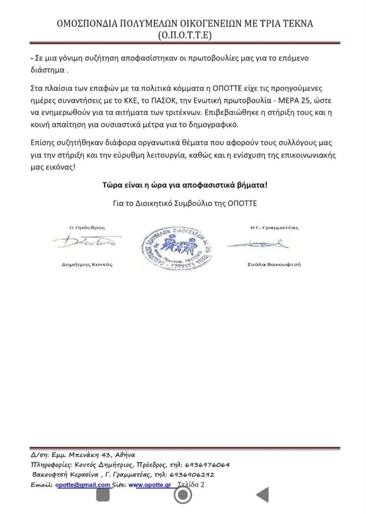 Στα πλαίσια των επαφών με τα πολιτικά κόμματα η ΟΠΟΤΤΕ είχε τις προηγούμενες ημέρες συναντήσεις με το ΚΚΕ, το ΠΑΣΟΚ, την Ενωτική πρωτοβουλία – ΜΕΡΑ 25, ώστε να ενημερωθούν για τα αιτήματα των τριτέκνων. Επιβεβαιώθηκε η στήριξη τους και η κοινή απαίτηση για ουσιαστικά μέτρα για το δημογραφικό.